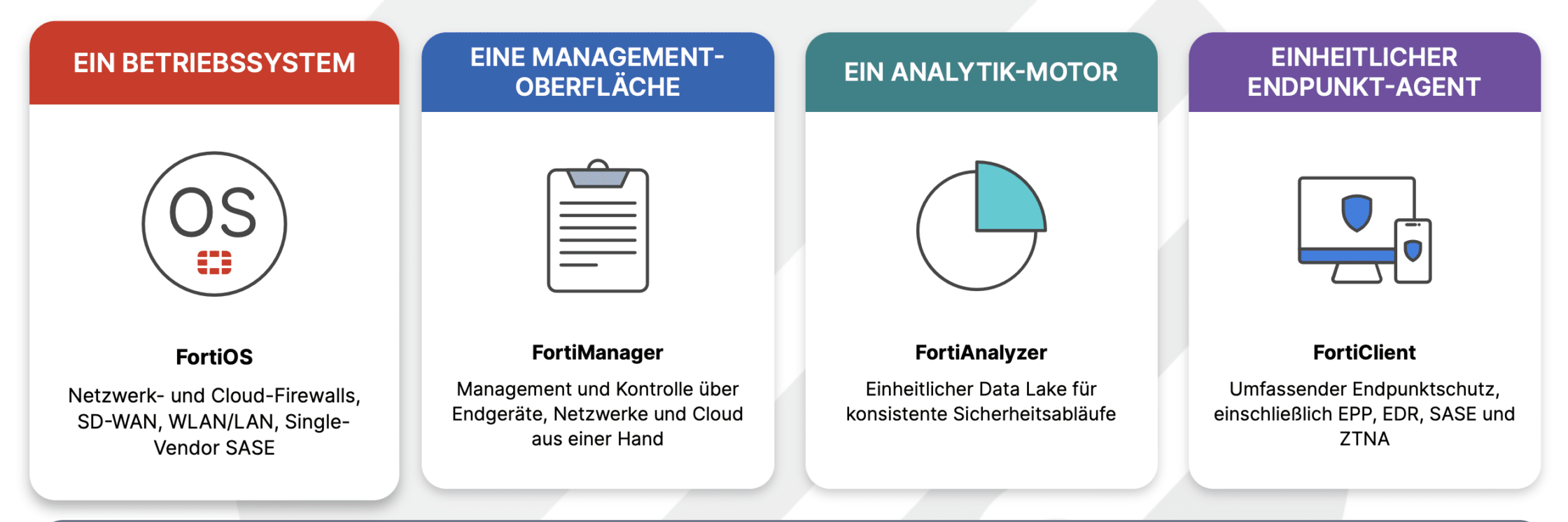 • FortiOS: Das Betriebssystem von Fortinet bildet das Fundament der Fortinet Security Fabric. Diese Plattform integriert Sicherheits- und Netzwerkelemente nahtlos und bietet ein einheitliches Management sowie umfassende Transparenz und Kontrolle über alle Umgebungen – von On-Premises bis hin zu Cloud und IoT.