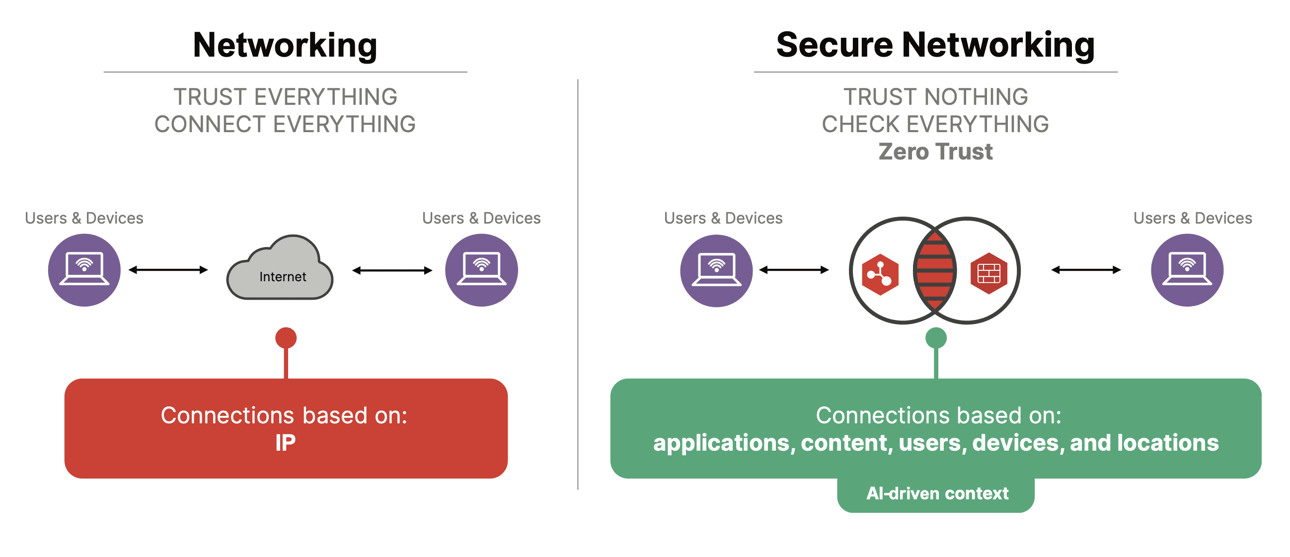 Die wichtigsten Netzwerk- und Internetprotokolle wurden vor 50 Jahren entwickelt und basieren auf dem Prinzip des Vertrauens und der Vernetzung. Heute verstecken sich viele Cyberangriffe in den Anwendungs- und Inhalts-Ebenen, die von Netzwerkgeräten wie Routern und Switches nicht erkannt werden können. Fortinet Secure Networking setzt auf eine Zero-Trust-Strategie, bei der jede Anwendung und deren Inhalte, Daten, Nutzer, Geräte und Standorte überprüft werden, bevor Verbindungen hergestellt werden.