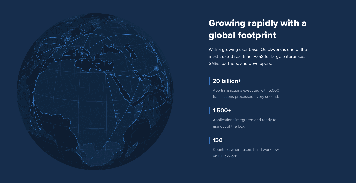 Mit einer wachsenden Nutzerbasis ist Quickwork eine der vertrauenswürdigsten Echtzeit-iPaaS-Lösungen für große Unternehmen, KMUs, Partner und Entwickler weltweit. Unsere Plattform hat über 20 Milliarden App-Transaktionen ausgeführt und verarbeitet 5.000 Transaktionen pro Sekunde. Wir bieten über 1.500 sofort einsatzbereite App-Integrationen und sind in mehr als 150 Ländern vertreten.